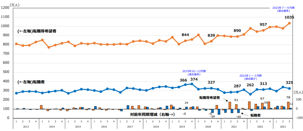 総務省統計局の2023年の調査によれば、転職者数は325万人、転職等希望者数は過去最多の1,035万人に上ることが報告されています。